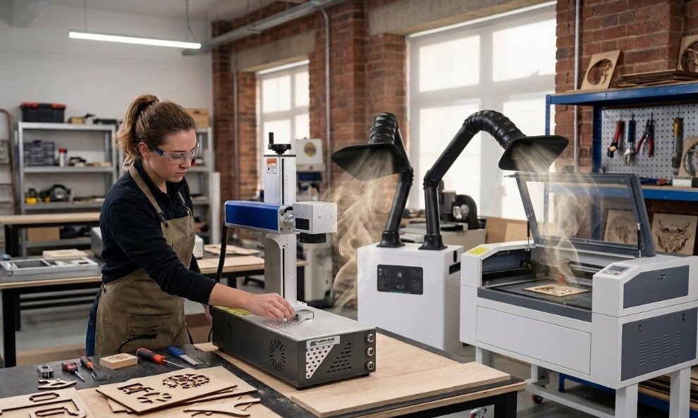 Láser Galvo Fibra: Extracción de polvo metálico y humos de marcado.