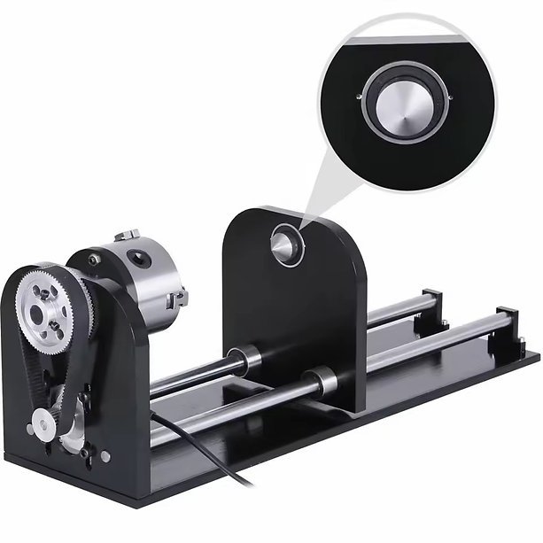 Sujeción de Alta Firmeza: El mandril industrial evita que el objeto resbale durante el grabado de alta velocidad, ideal para termos (tipo Yeti), botellas de vidrio y piezas de madera.