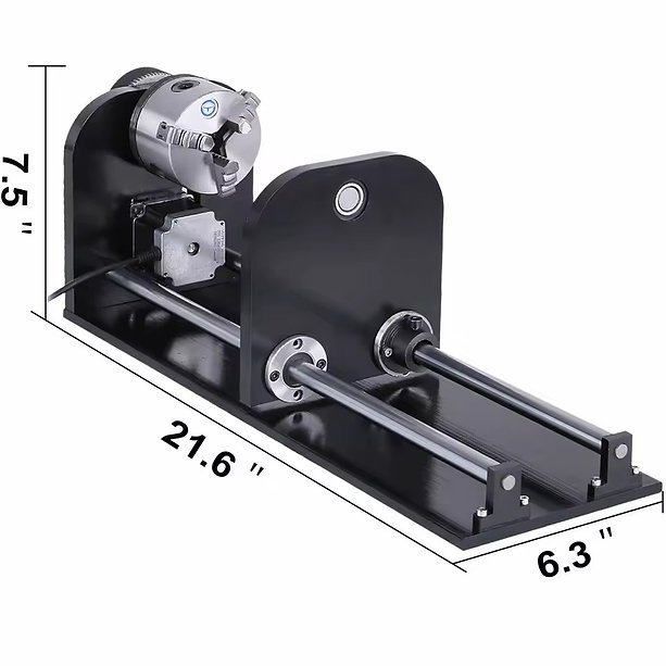 El Eje Rotativo de Mandril de 3 Mordazas es un periférico de precisión diseñado para máquinas de corte y grabado láser CO2 industriales. A diferencia de los modelos de rodillos, este sistema sujeta mecánicamente la pieza, permitiendo una mayor estabilidad y la capacidad de trabajar con objetos de diámetros irregulares o de mayor peso.