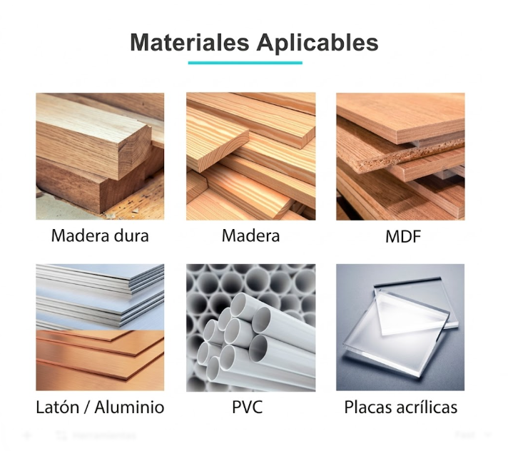 | Aplicación | Todos los materiales de composición, madera contrachapada, madera dura y PVC redwood, tablero de plástico, acrílico, placa de doble color, ABS, latón, aluminio, etc. |